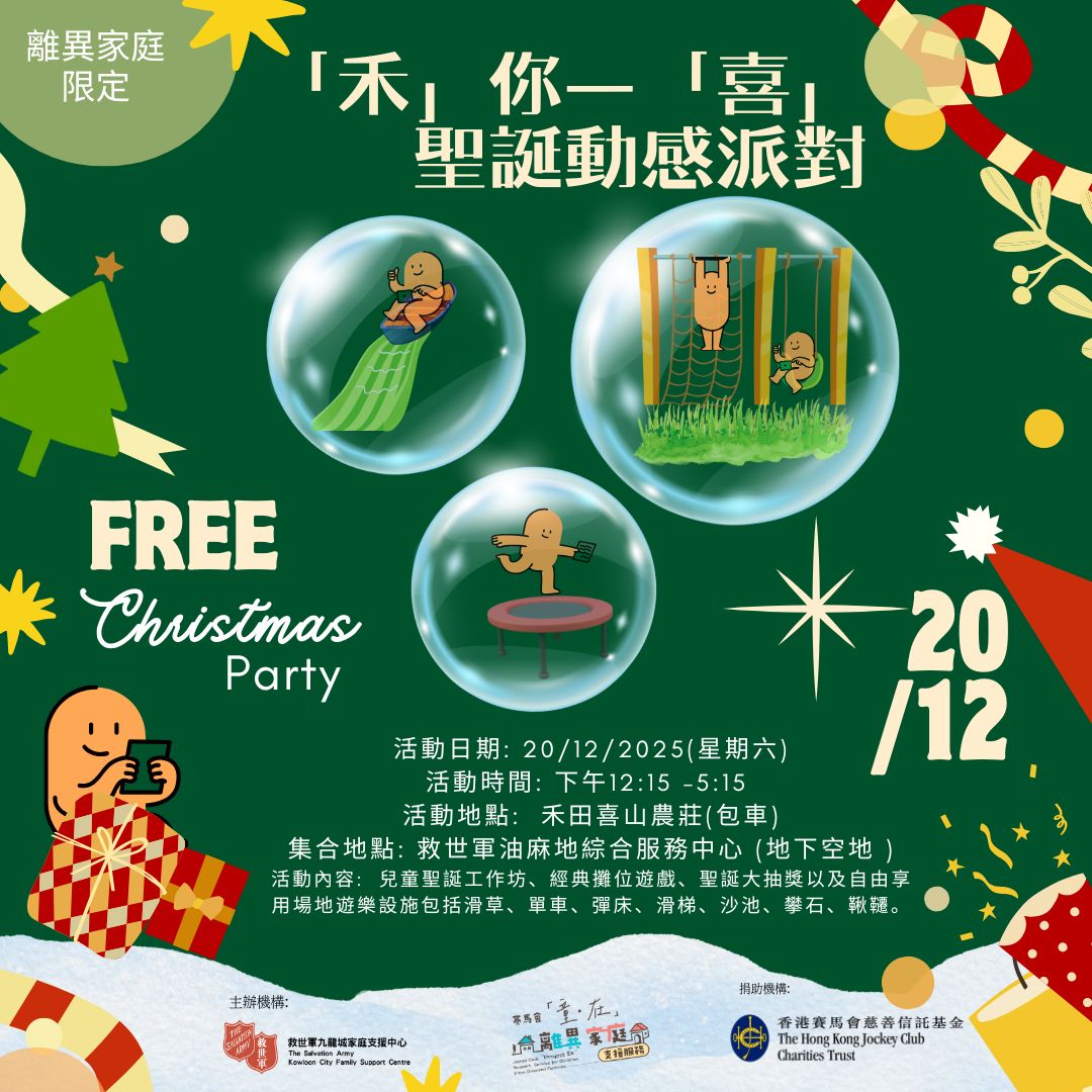 | 內容: | 兒童聖誕工作坊、經典攤位遊戲、聖誕大抽獎以及自由享用場地遊樂設施包括滑草、單車、彈床、滑梯、沙池、攀石、鞦韆。 |