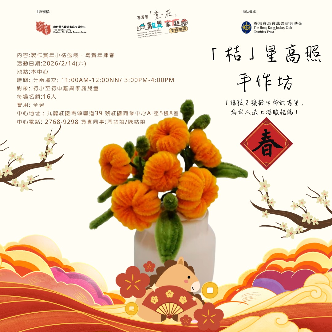 | 內容: | 製作賀年小桔盆栽🐎🧧、寫賀年揮春,「讓孩子發掘生命的吉星,為家人送上溫暖祝福」。❤️ |